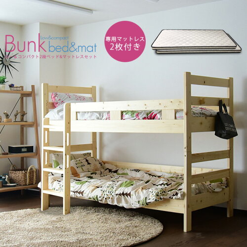 !!* 2段ベッド 二段ベッド ロータイプ おしゃれ コンパクト マット付き パームマット 分割 子供 セミシングル パイン ホワイト ナチュラル ハンガーラック すのこベッド シンプル 子供部屋 高さ137cm 小スペース