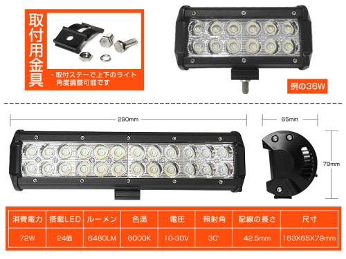 【製品仕様】 商品名:OSRAM製 LED作業灯 チップ搭載数:24個 LED Power:72W カラー:ホワイト 色温度:6000K ルーメン:6480LM 電圧:DC 10V-30V 防水等級:IP67 本体材質:アルミ レンズ材料:強化ガラス 取付金具:ステンレス 照射角:狭角タイプ(光角度:30°) 寿命:約35000時間 サイズ(約):290X65X79(mm) 商品内容:ライト×1個、取付金具×2式 【商品詳細】 OSRAM社製LEDで眩しいほどの明るさを実現しました!「高輝度」、「全方面拡散」、「低電力」、「長寿命」などの特性を持ちながら、値段もそんなに高くありません! ◆CREE社 LEDチップ:OSRAM社 LEDチップを採用、低エネルギー消費量、高輝度を実現! ◆放熱設計:バックはフレーク状設計で放熱率は大幅アップします。